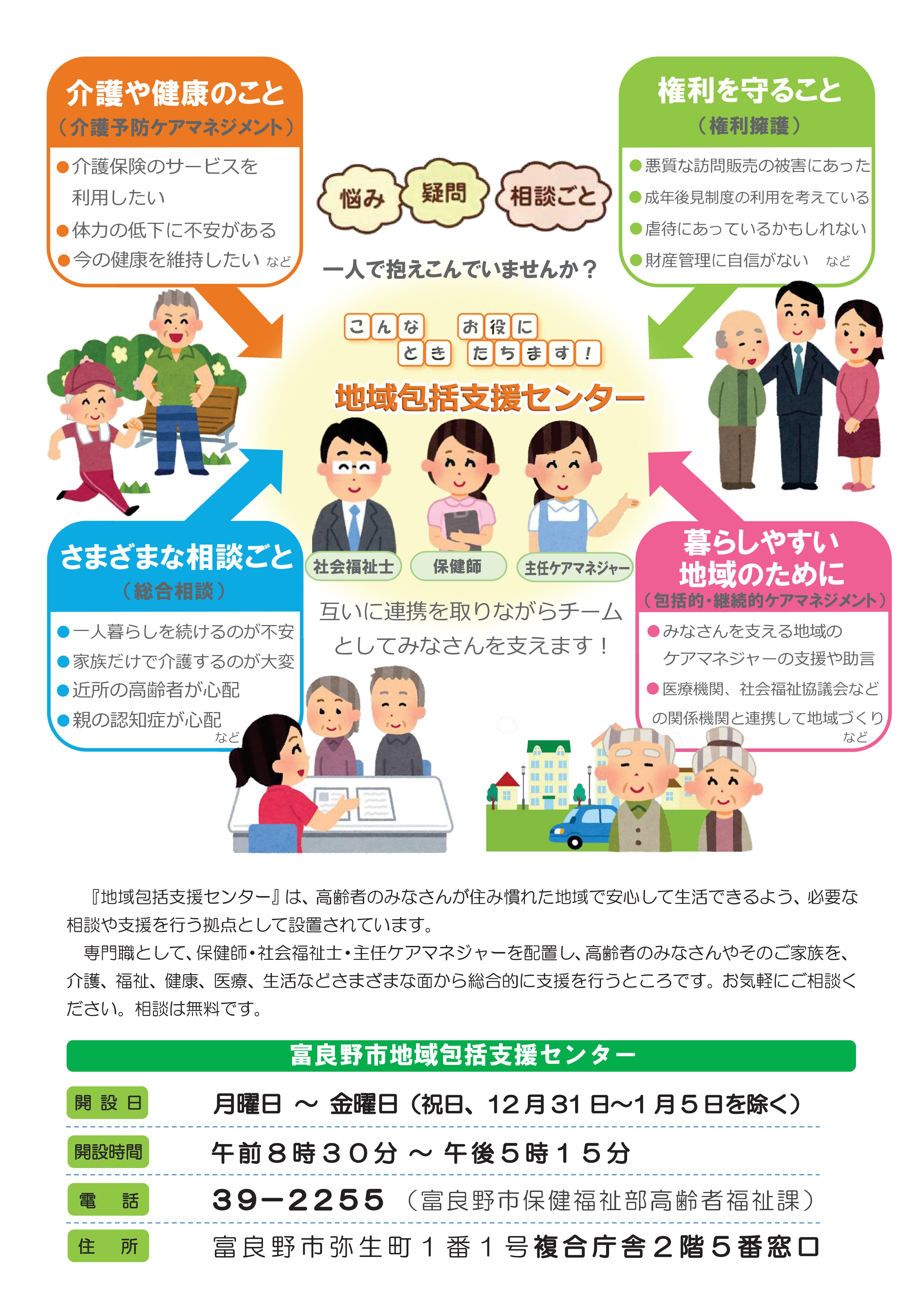 地域包括支援センターは、高齢者のみなさんが住み慣れた地域で安心して住み続けられるように、介護・福祉・保健・医療等、さまざまな面で相談や支援を行うための総合相談機関です。