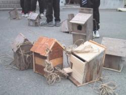 5月24日、今にも雨が降りそうな中をぬって愛護少年団巣箱点検が行われました。今年も4班に分かれて、グラウンド周辺学校林に10個程度の小鳥の巣箱を取り付けました。 開会式での校長先生のお話。「皆さんは巣箱点検は誰のために行っていると思いますか?」との問いに(そりゃー、小鳥のためにですよ)と心の中でつぶやいた。ところが校長先生は「私たちのために行っているんですね」とおっしゃるので、始まる前から盛り上がりました。「小鳥にとっては人間がいなくなるのが最良の環境、小鳥が住みやすい環境をつくるということは結局自分たちのためにやっていることだ」という校長先生の話に、うなずく生徒たち。よくよく考えればそういうことなのです。人間はエゴですね・・・ |