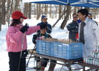ゴール地点にはクジが用意されました,ジュースや帽子,ジャガイモ1箱などが景品になっていて,多くの参加者の方に好評でした。 会場では,役員の方々が作ってくださった豚汁や甘酒を飲み,富良野のおいしいジャガイモを食べ,心も身体もホカホカ。みんなで火を囲み,知らない人同士でも話が盛り上がり,たくさんの笑顔が会場にありました。 「来年もまた来たいですね」と話してくださった人がほとんど。また多くの方と交流ができるのが今から楽しみです。 | ||||||
